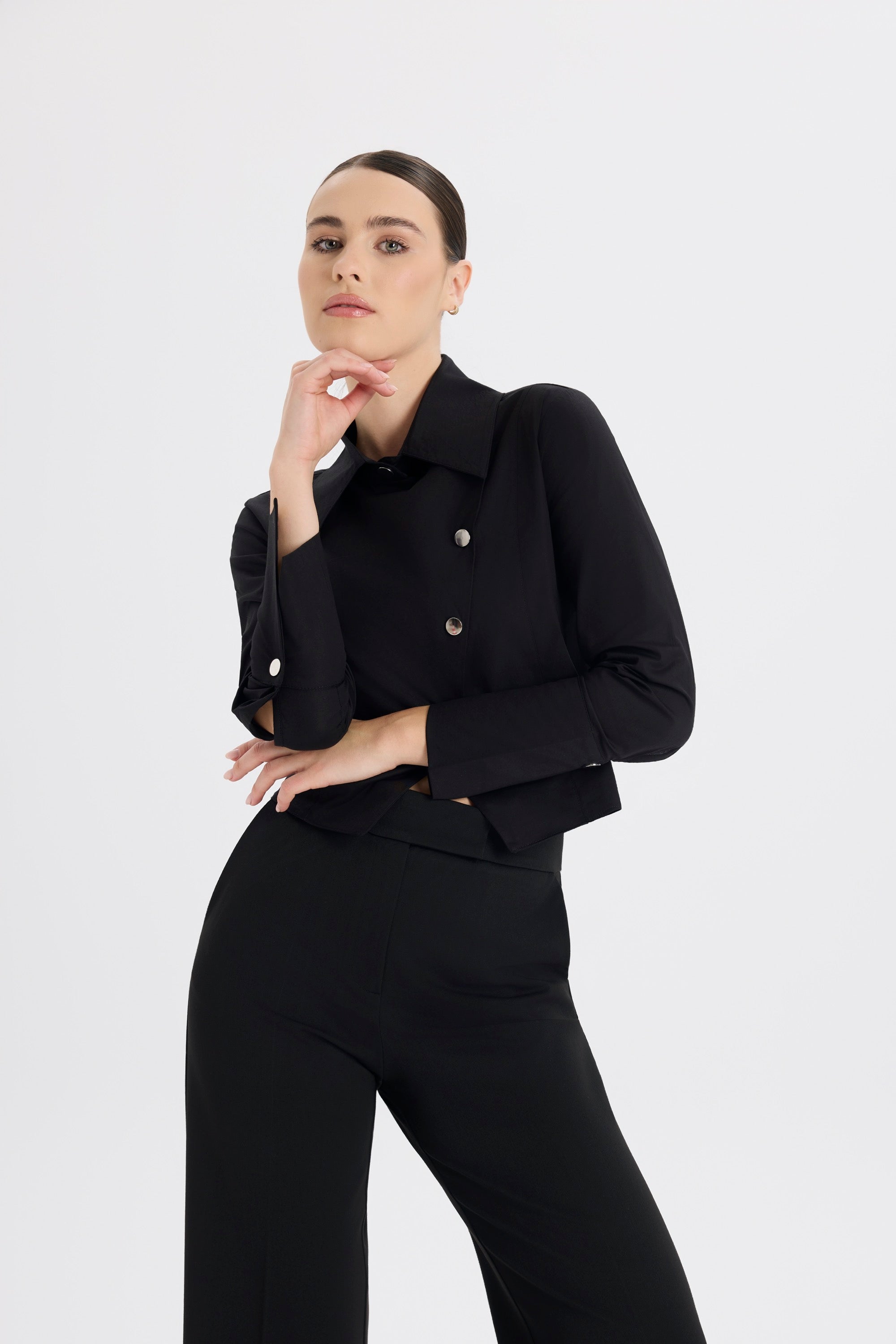 Asimetrik Metal Düğme Detaylı Siyah Poplin Gömlek