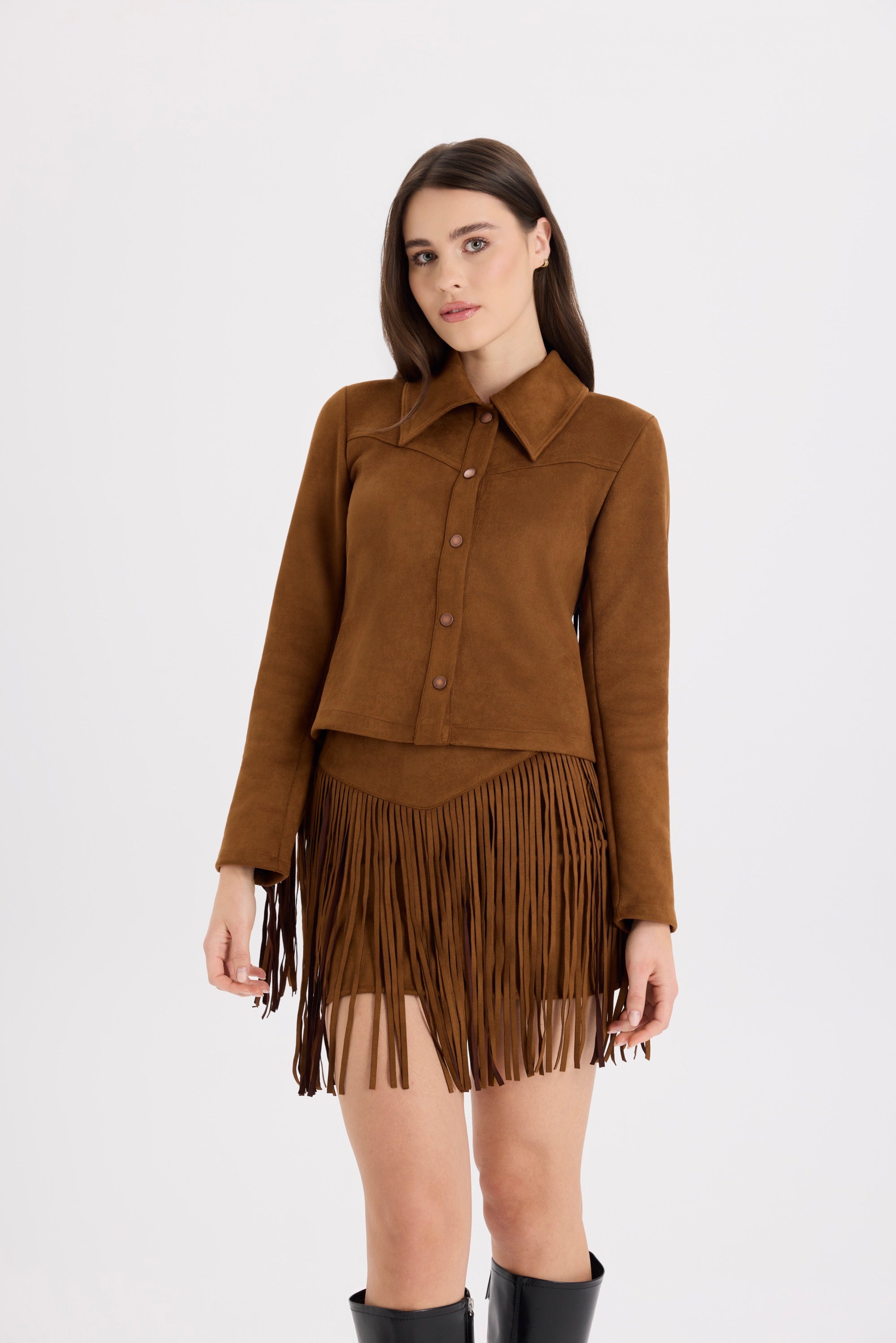 Combining Western aesthetics with the modern urban woman, this fringed suede skirt is one of Derin & Co.'s bold and characterful designs. Soft, premium suede fabric combines with long, vibrant fringing details to create a strong, feminine, and dynamic silhouette.