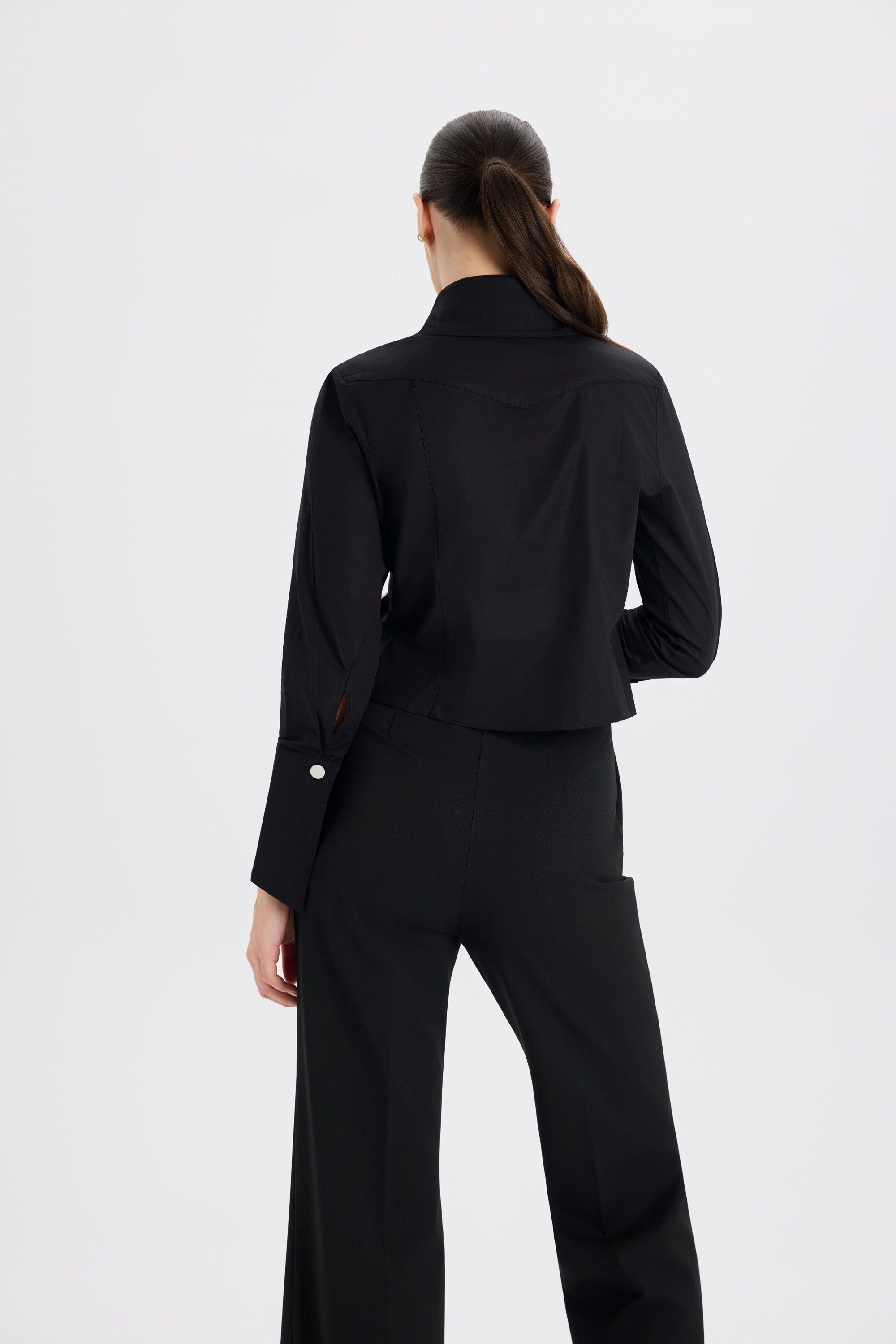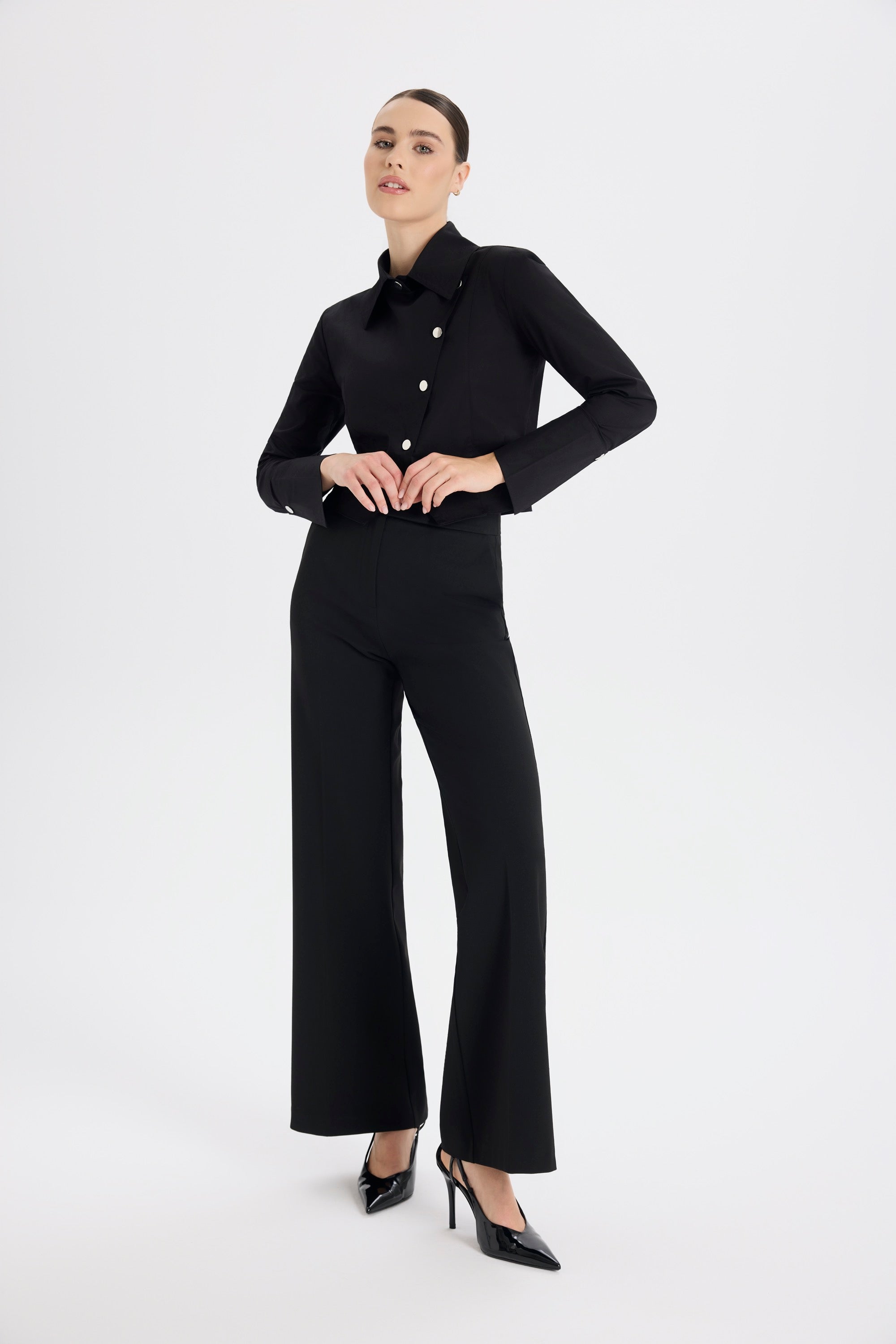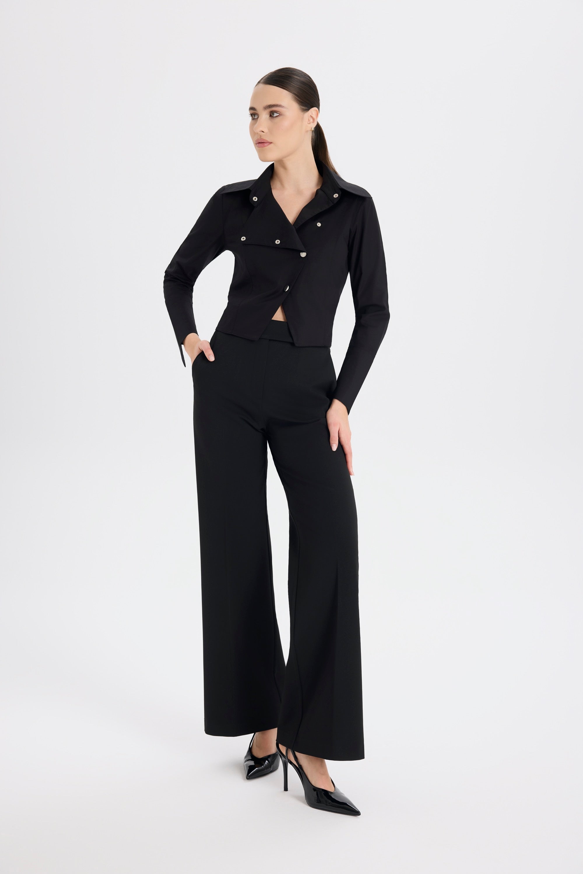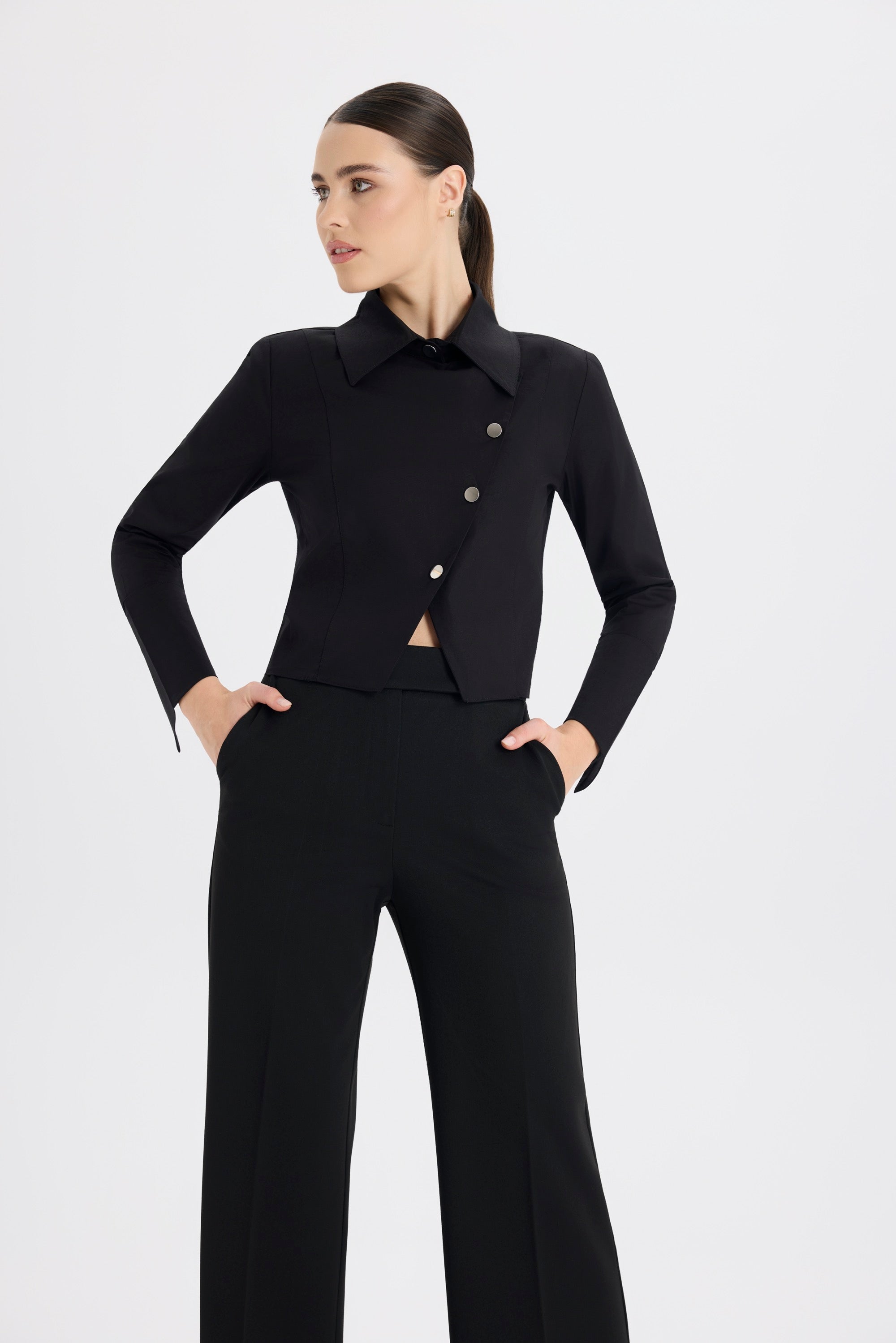 Asimetrik Metal Düğme Detaylı Siyah Poplin Gömlek